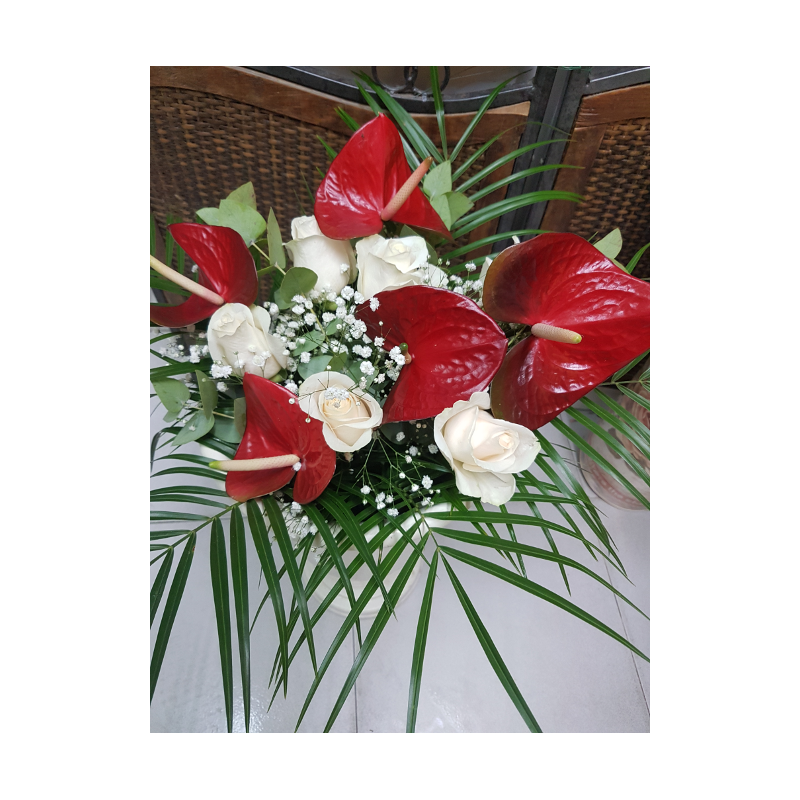 Ramo de rosas blancas y anturium